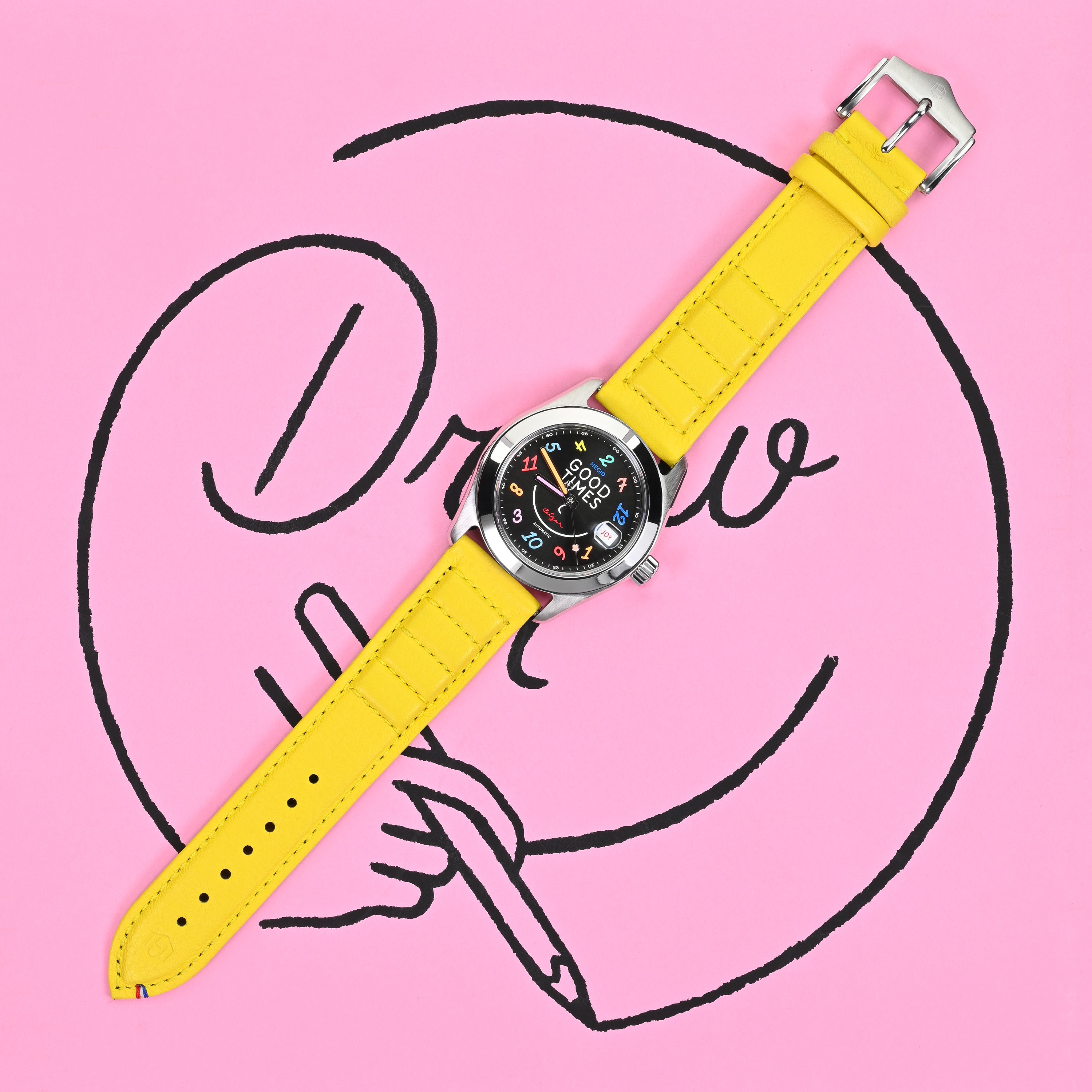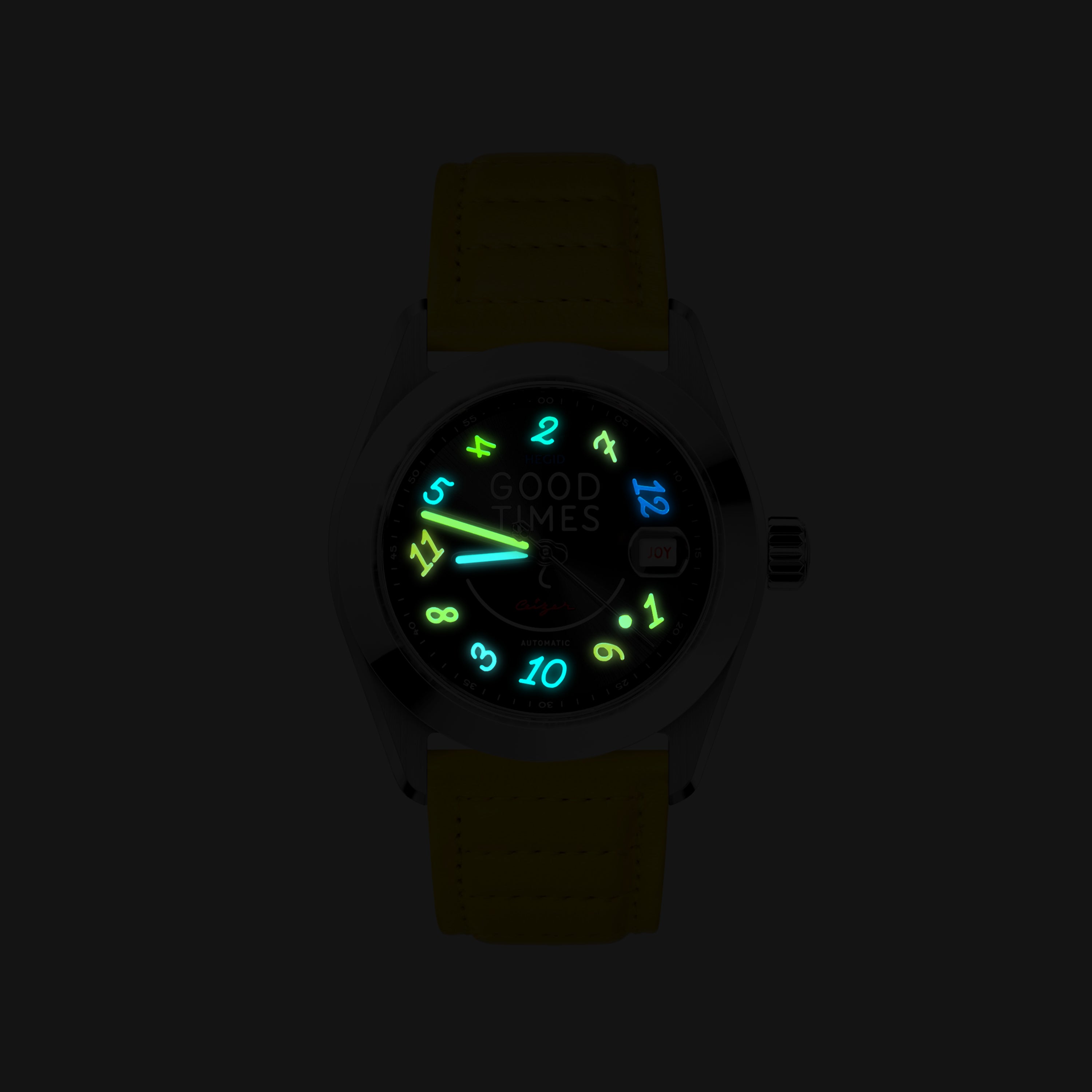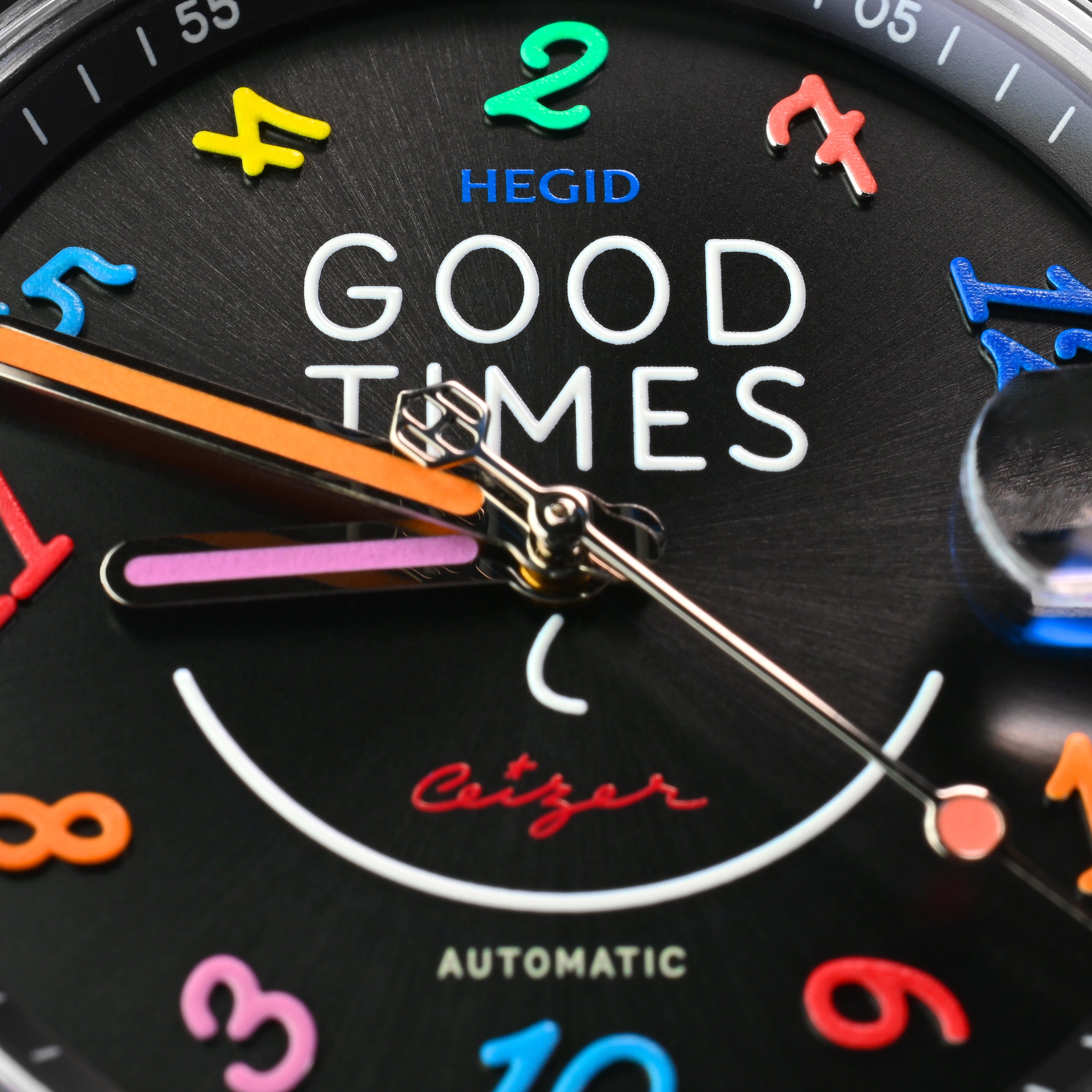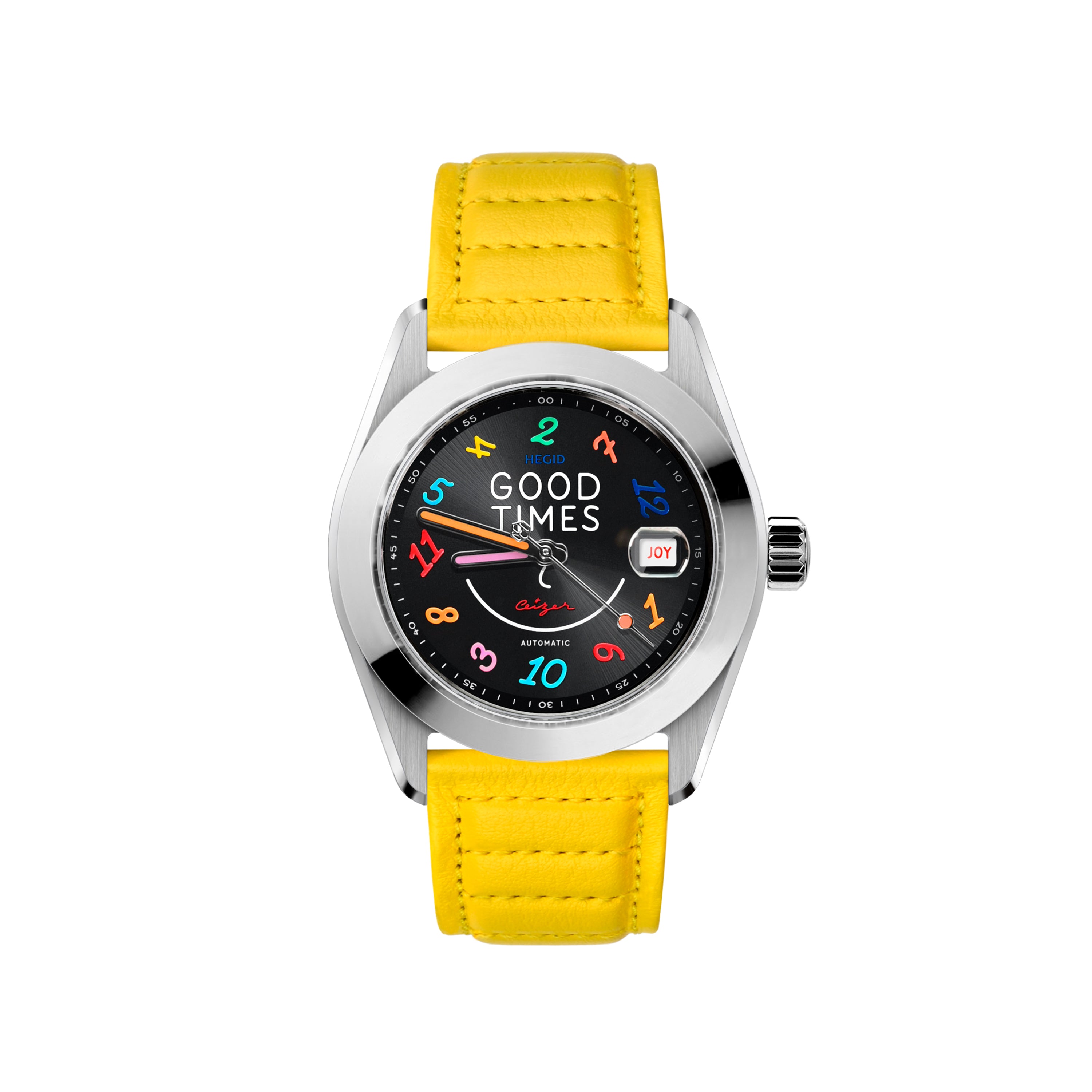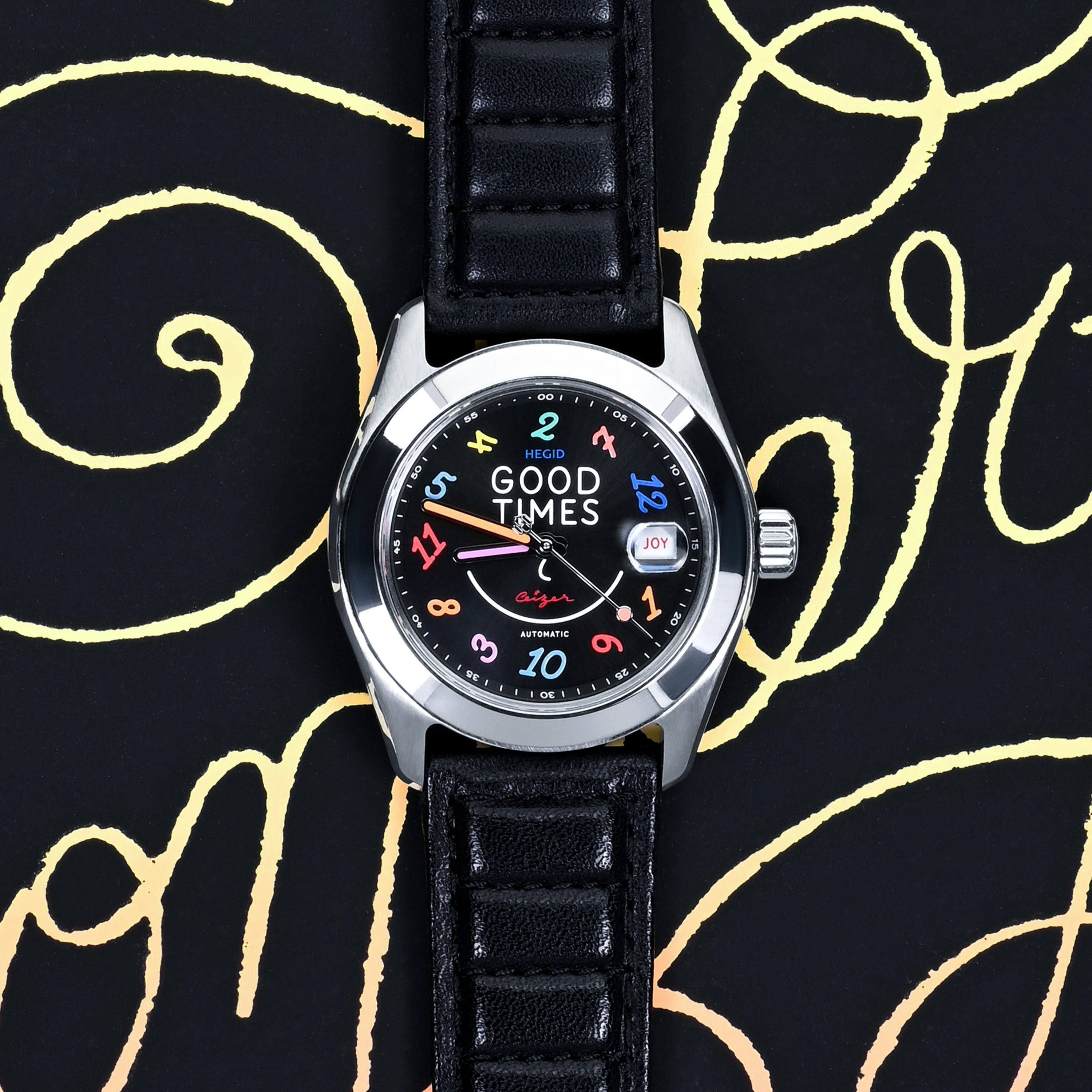 The GOOD TIMES watch was born from the encounter between Hegid's durable watchmaking and the colorful typographic universe of artist Pieter Ceizer. This limited edition invites us not just to endure time, but to celebrate it with a smile. It is a mechanical manifesto for joie de vivre.