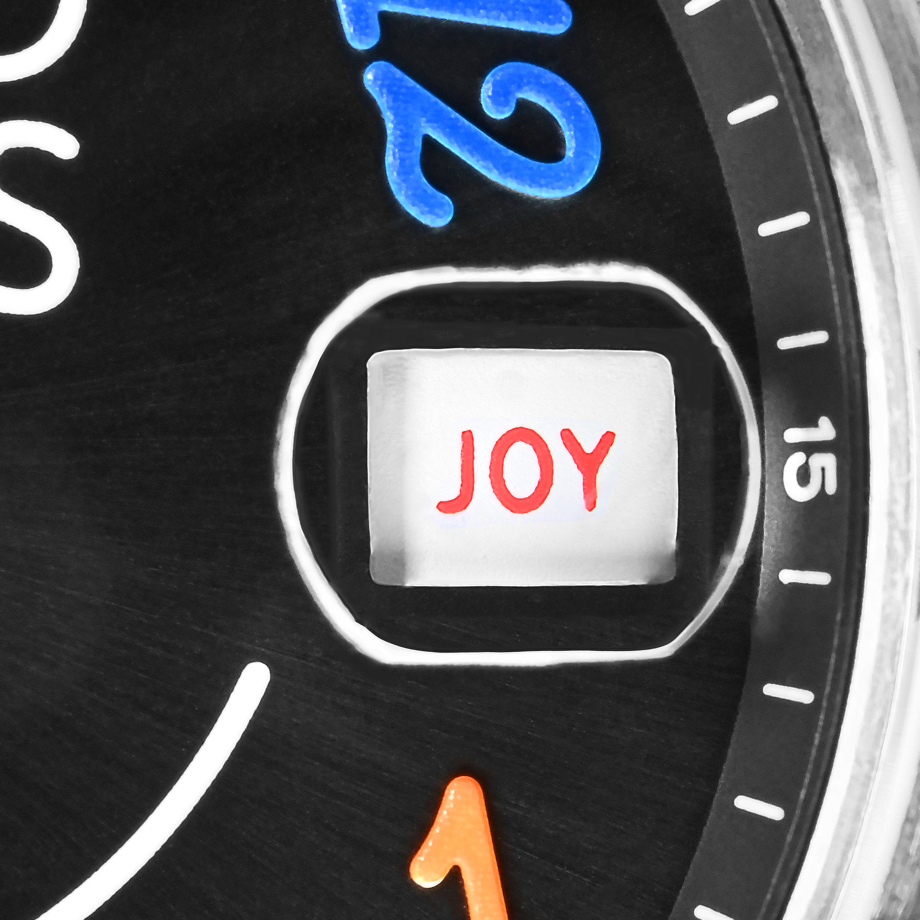 The hour markers are intentionally placed out of order—a philosophical invitation not to take time, or oneself, too seriously. The fluid second hand flies over a smiley face, reminding us that every instant counts. A poetic touch is hidden in the capsule’s date window: here, numbers give way to words. Each day, a 'MOOD OF THE DAY' (such as "JOY", "RAD", "SEX") appears, transforming the first glance at one’s watch into a daily ritual of optimism.