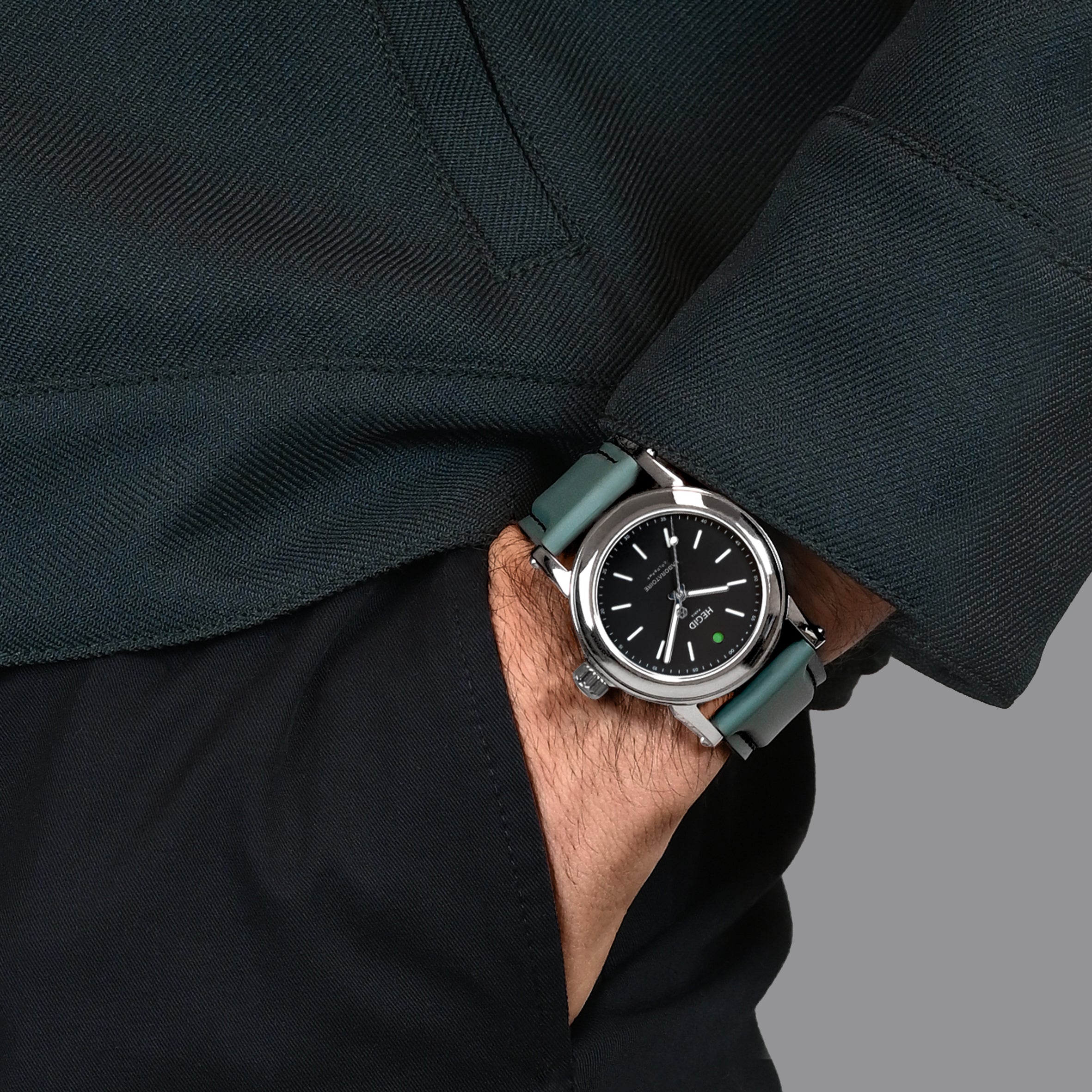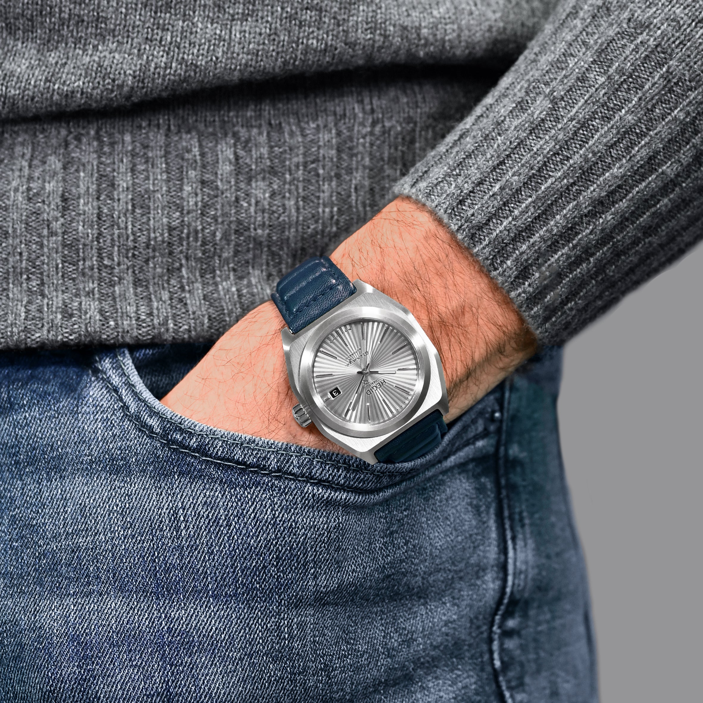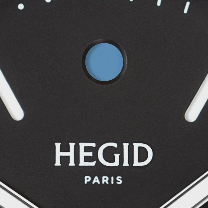 La montre d'Hegid inspirée par la fin des années 60 et des premières supercars se distingue par sa carrure brossée à traits tirés et les 120 facettes de son cadran qui permettent de se situer dans le temps, avec élégance et précision.